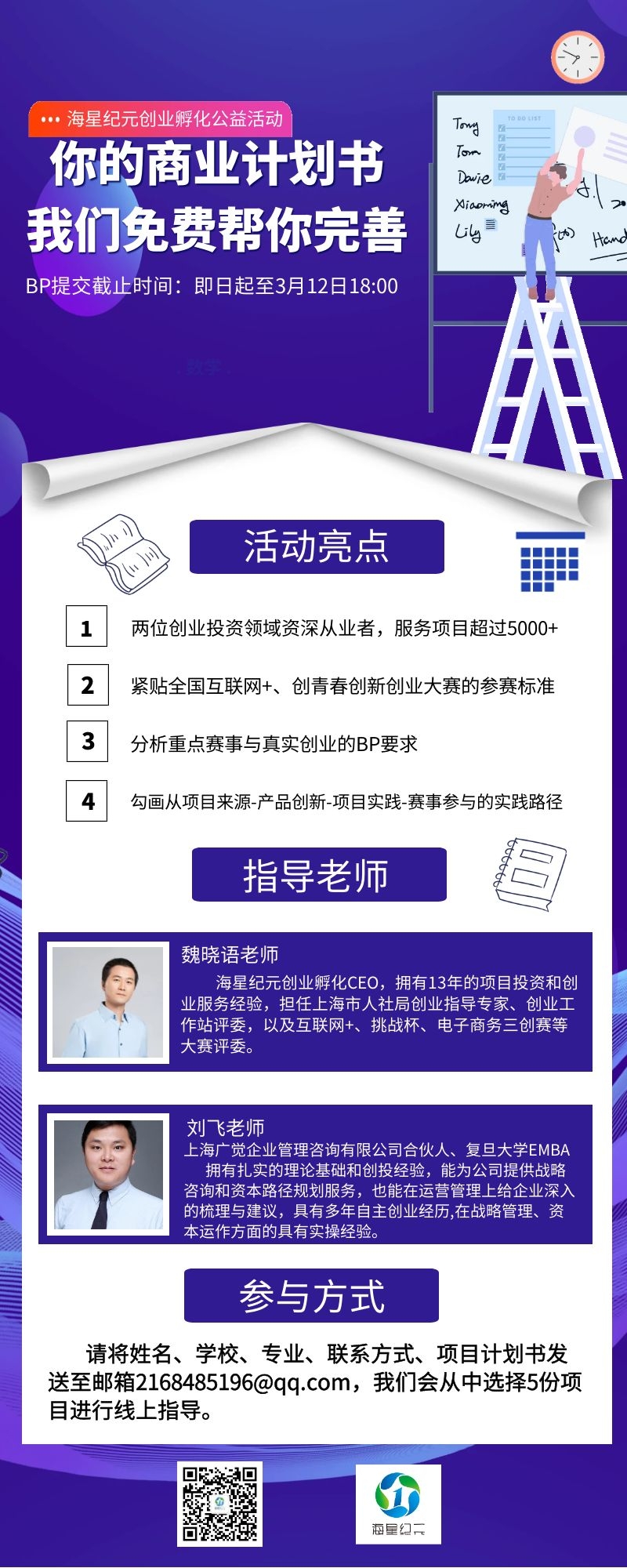 海星纪元创业孵化决定疫情期间为大学生创业团队提供线上商业计划书【免费】指导服务,在家就可以打磨、完善创业项目,努力获得好成绩!