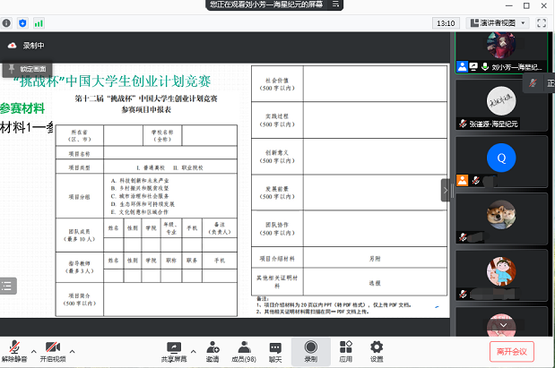 1月17日下午,应上海立信会计金融学院邀请,海星纪元团队以“挑战杯中国大学生创业计划大赛材料撰写”为主题,为上海立信会计金融学院100多名学生开展线上培训讲座。担任此次专题讲座讲师的有海星纪元培训助理张谨源、教研助理刘小芳。海星纪元团队首先根据学生们的挑战杯项目的特点和存在的主要问题提出了改进意见,之后开始介绍挑战杯项目申报具体需要哪些材料以及相关注意事项,重点围绕商业计划书的作用、结构和具体内容的写作进行讲授,同时引入相关案例作为补充,让学生们了解商业计划书的重要性,对挑战杯大赛有了更为清晰的了解和规划。最后海星纪元团队对于学生们的提问进行了解答。