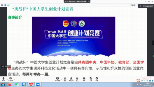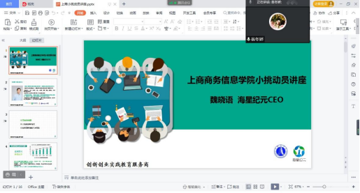 10月21日晚,应上海商学院邀请,海星纪元CEO魏晓语、教研助理刘小芳以挑战杯中国大学生创业计划大赛备赛为主题,为商务信息学院近100名大一、大二的学生进行线上动员讲座。海星纪元团队围绕着赛制安排、选题方向、项目构建,概括地介绍了小挑的基本情况,也为刚刚接触创新创业的学生团队指明需要关注“科技创新+时事热点”,在早期选题方面初步明确了大致方向。