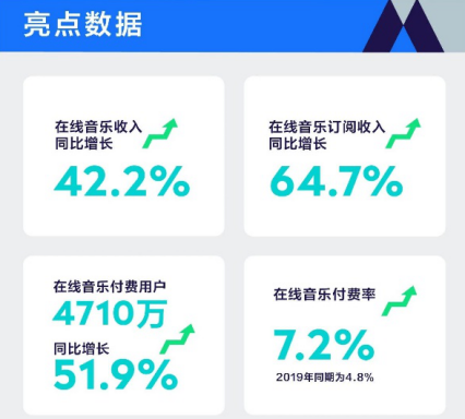 2020年8月,腾讯音乐发布截至2020年6月30日的第二季度财务报告。财报显示,2020年第二季度腾讯音乐总营收为69.3亿元,同比 增长17.5%, 调整后净利润为人民币11.5亿元。同时,在线音乐订阅收入实现强劲增长,同比增长64.7%至人民币 13.1亿元。