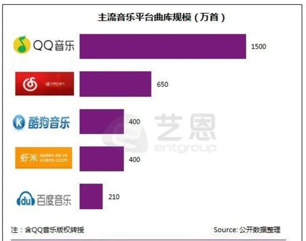 与之形成强烈对比的,是在大战中崛起的QQ音乐。一直深耕 “数字版权” 的腾讯早在版权新政策正式出台前的2014年,就开始接触三大国际唱片公司——环球、索尼和华纳,形成了难以撼动的 版权壁垒。 据15年10月艺恩娱乐数据库显示,排名第一的QQ音乐以其1500万首的曲库规模稳坐版权交椅,而虾米音乐连腾讯的一半都没有达到。