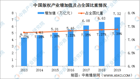 据2019年中国版权产业经济贡献的调研报告显示,2019年中国版权产业的行业增加值为7.32万亿元 人民币,同比增长10.34% ;占GDP的比重为7.39%,比上年提高0.02个百分点。 与此同时,文创产业对以版权而衍生的一系列优秀IP、创意产品倾入了更多的关注。就如此前以故宫文创为主题的综艺节目《上新了·故宫》,自开播后引发了前所未有的广泛关注。节目以寻找宫廷中不为人知的场所和生活痕迹为主题,揭秘了乾隆花园、畅音阁等故宫多处秘境,成为现象级文化类综艺节目。故宫的每期节目都会根据故宫文化特征诞生一个文化创意衍生品,截至12月底,“上新了·故宫”同步发售了4期栏目同款文创产品,筹款金额超过1387.5万元,参与人次超过2.8万人次。