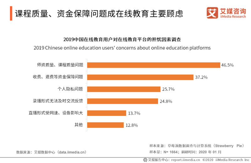 根据艾媒咨询发表的一项问卷调查显示,在线教育用户最在意的是教学质量问题,相比于其他五个方面来说占到了“46.5%”。如此可见,线上教育的质量保证,对比线下教育来说,难免地令人抱有怀疑的态度。